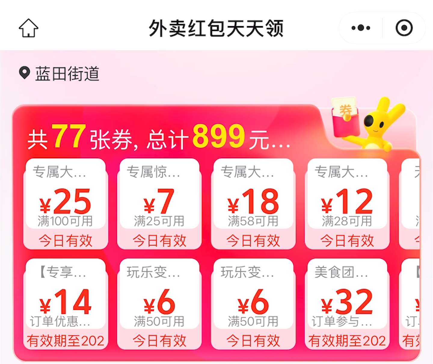 点击领红包点外卖,接下来就直接跳转到美团的隐藏券包界面。在这里就可以直接免费领取到很多张大额的外卖券。